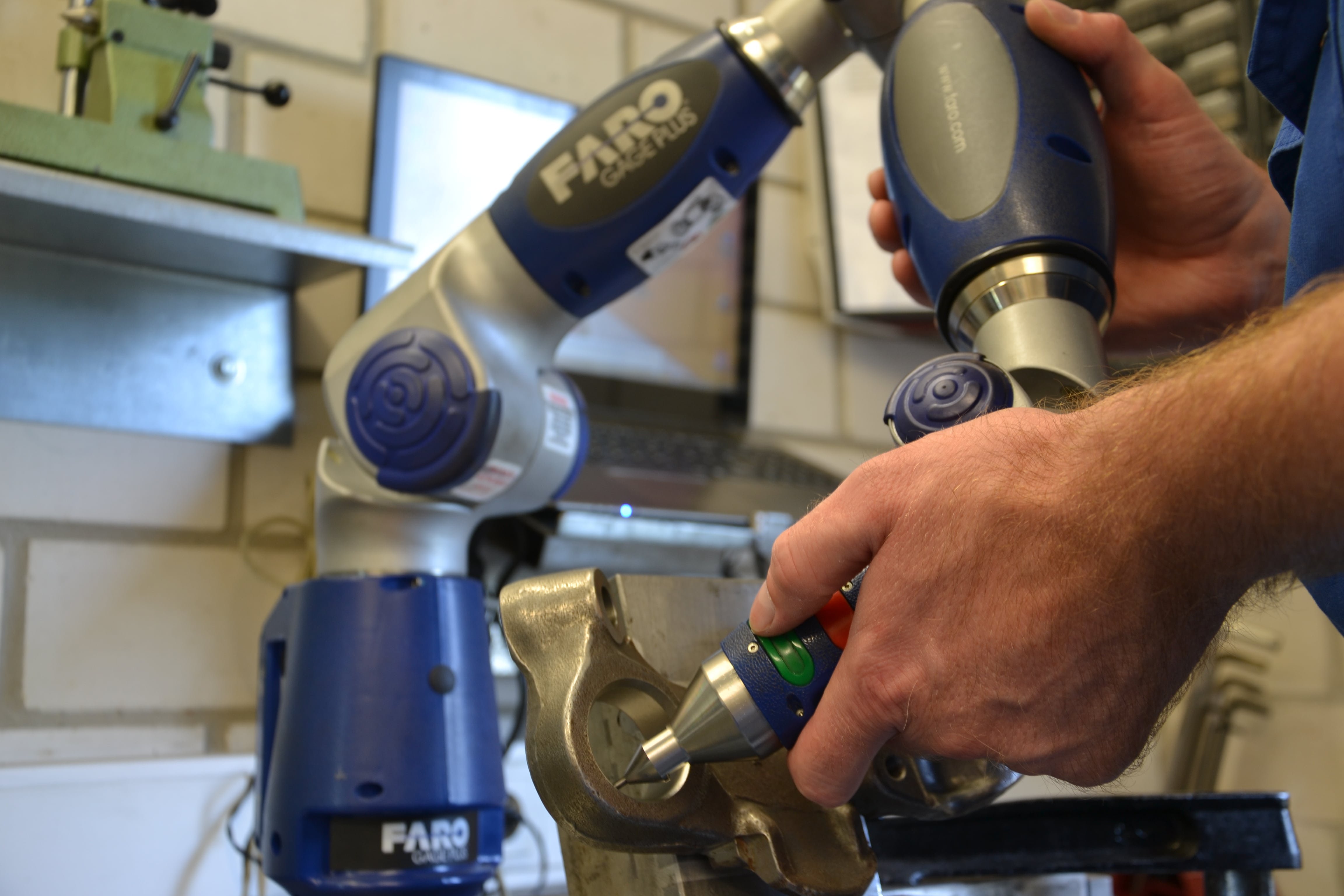 Der Faro-Mess-Arm ermöglicht es uns 3-Dimensionale Längen an komplizierten Teilen in einem 1,2m³ großen Arbeitsraum zu messen. Ob es Abstände von Bohrungen, die nicht in einer Ebene liegen, oder Winkellage zweier Flächen sind, diese Maße zu ermitteln ist mit dem Faro-Mess-Arm kein Problem.